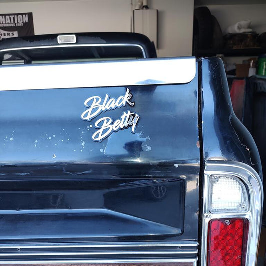 Black Betty Car Badge - Mirror Silver On Gloss Black - Script Font