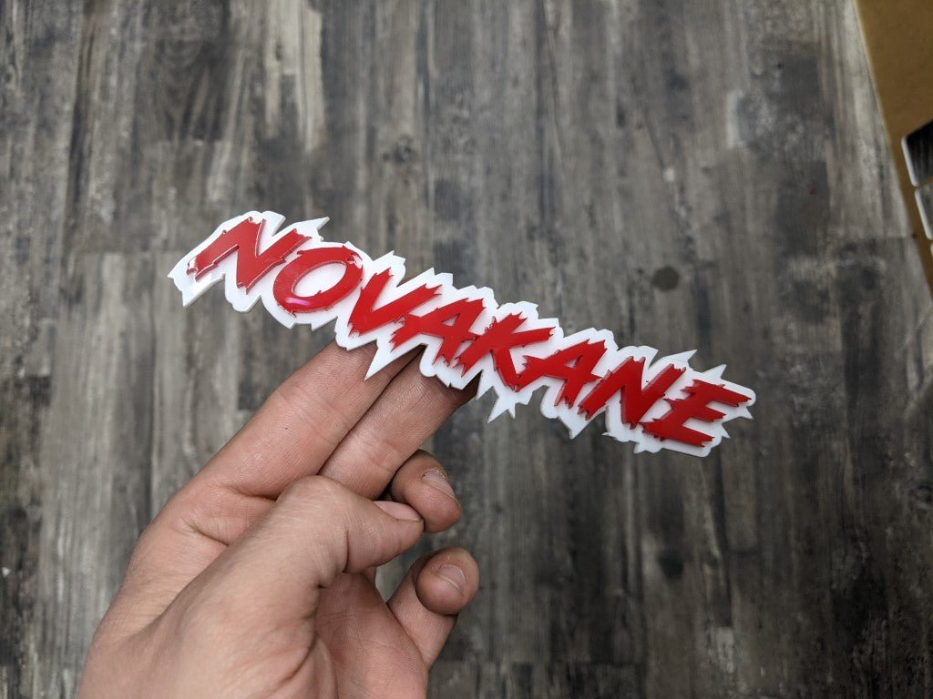 Insignia de coche Novakane - Rojo sobre blanco - Fuente Lightning - Montaje en cinta