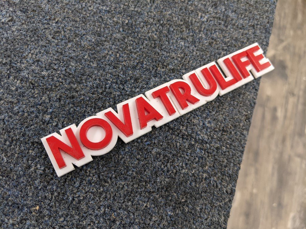 Insignia de automóvil Novatruelife - Rojo sobre blanco - Fuente de bloque