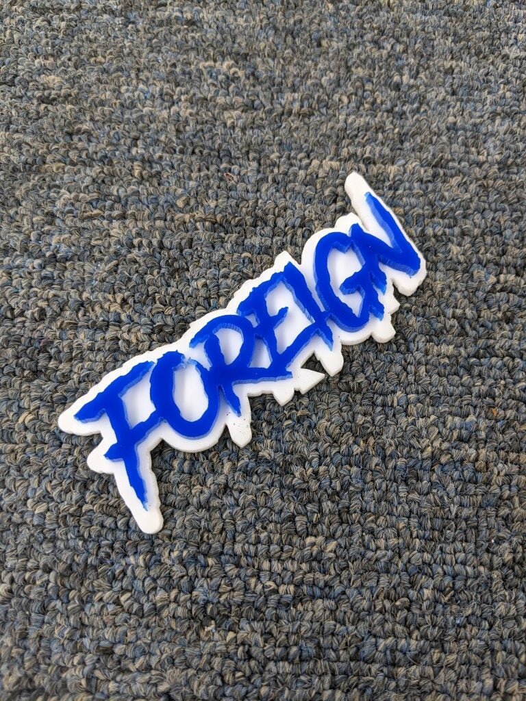 Insigne de voiture étrangère - Bleu sur blanc - Police agressive - Montage sur ruban adhésif