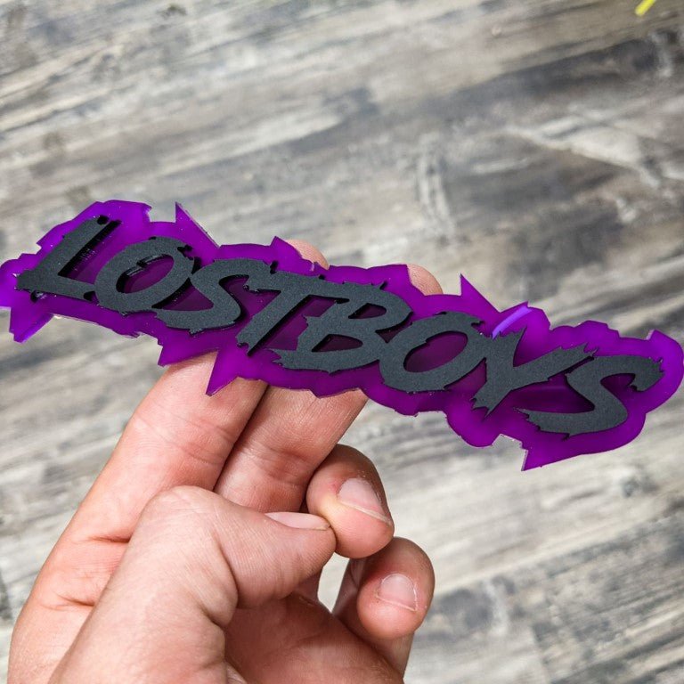 Badge de voiture Lostboys - Noir mat sur violet - Police Lightning - Montage sur ruban adhésif