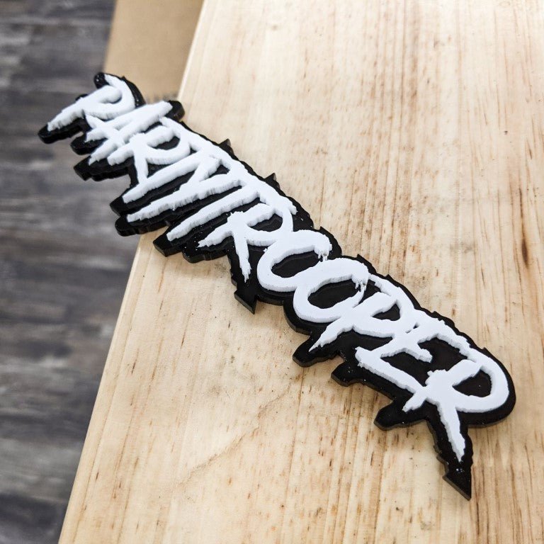 Insigne de voiture Partytrooper - Blanc sur noir brillant - Police agressive - Montage sur ruban adhésif