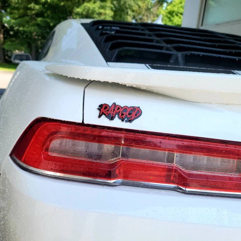 Badge de voiture Rapgod - Rouge sur noir brillant - Police agressive - Montage sur ruban adhésif