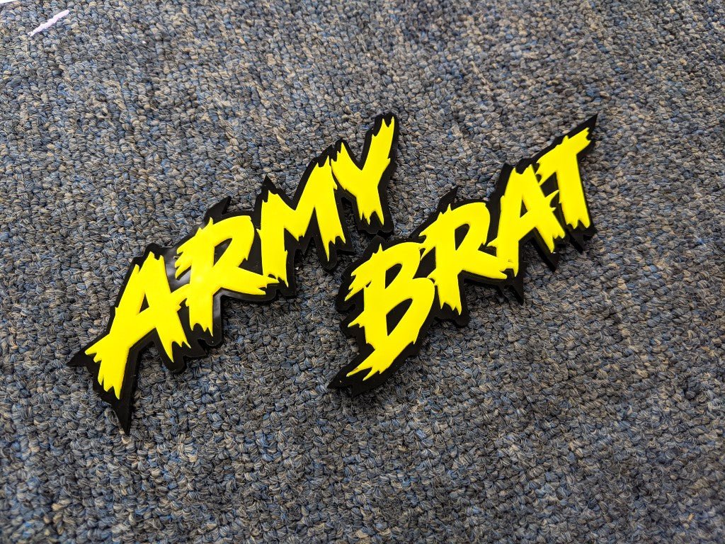 Army Brat Car Badge - Yellow On Gloss Black - Lightning Font