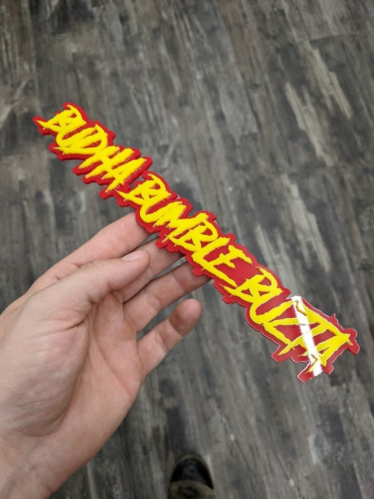 Budha Bumble Buzta Car Badge - Yellow On Red - Aggressive Font
