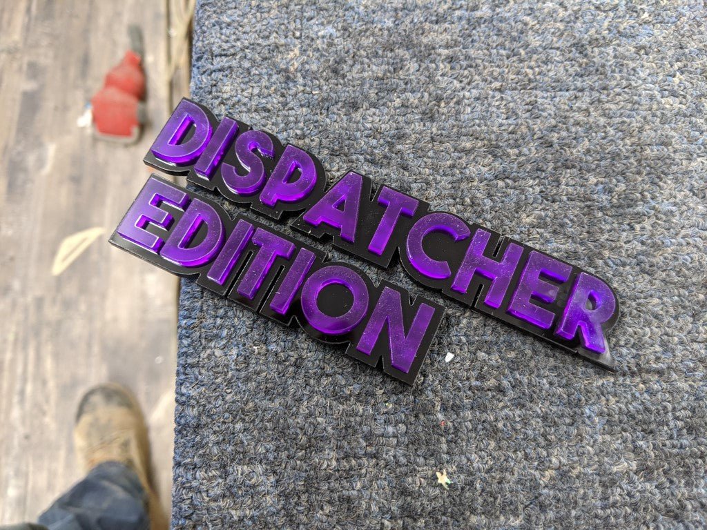 Dispatcher Edition Car Badge - Mirror Purple On Gloss Black - Block Font