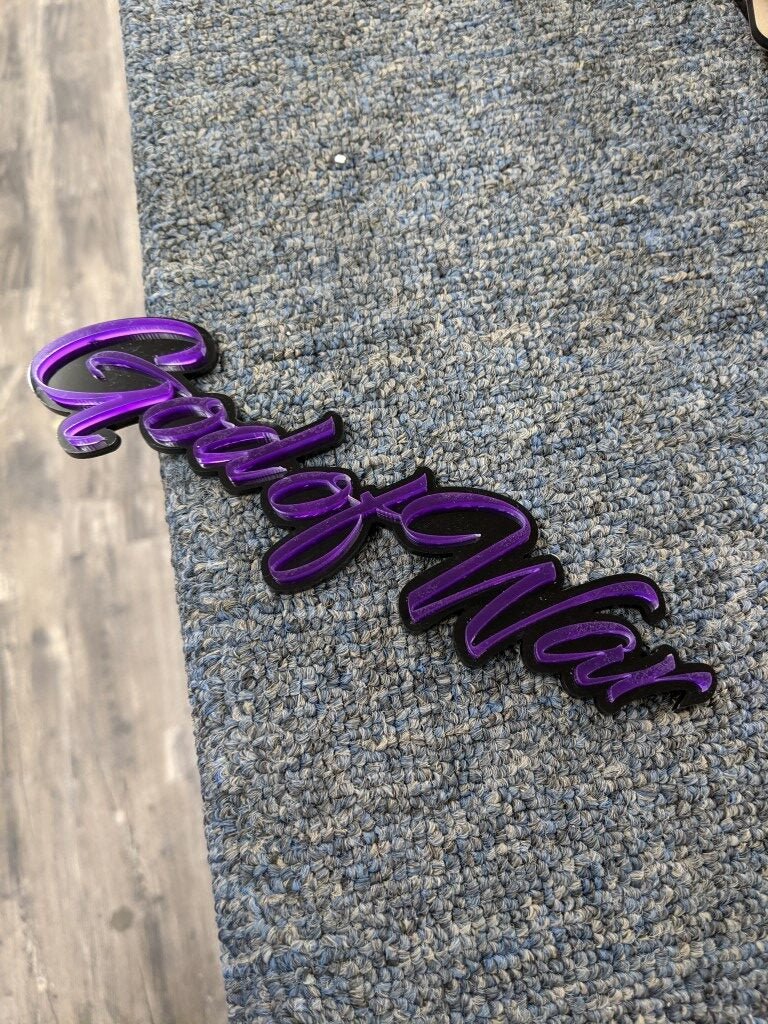 God Of War Car Badge - Mirror Purple On Gloss Black - Script Font