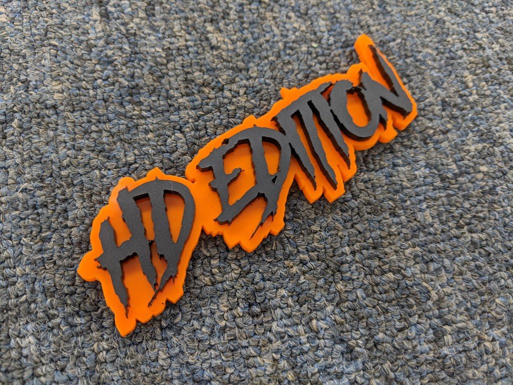 HD Edition Car Badge - Matte Black on Orange - Aggressive Font - Tape Mounting