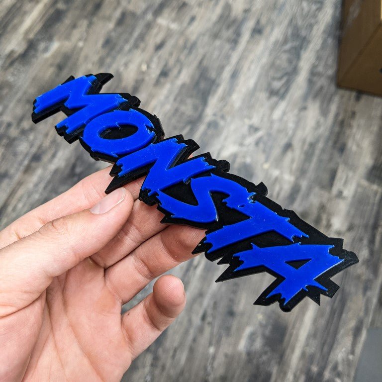 Monsta Car Badge - Blue on Gloss Black - Lightning Font - Tape Mounting