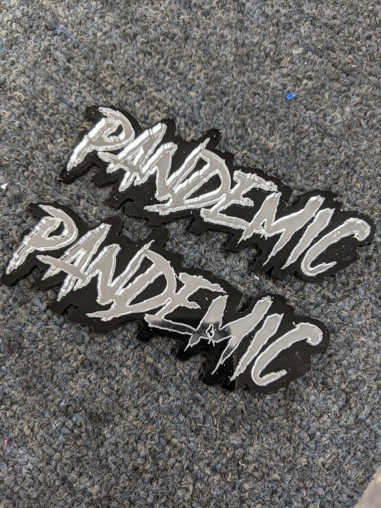 Pandemic Car Badge - Mirror Silver On Gloss Black - Aggressive Font