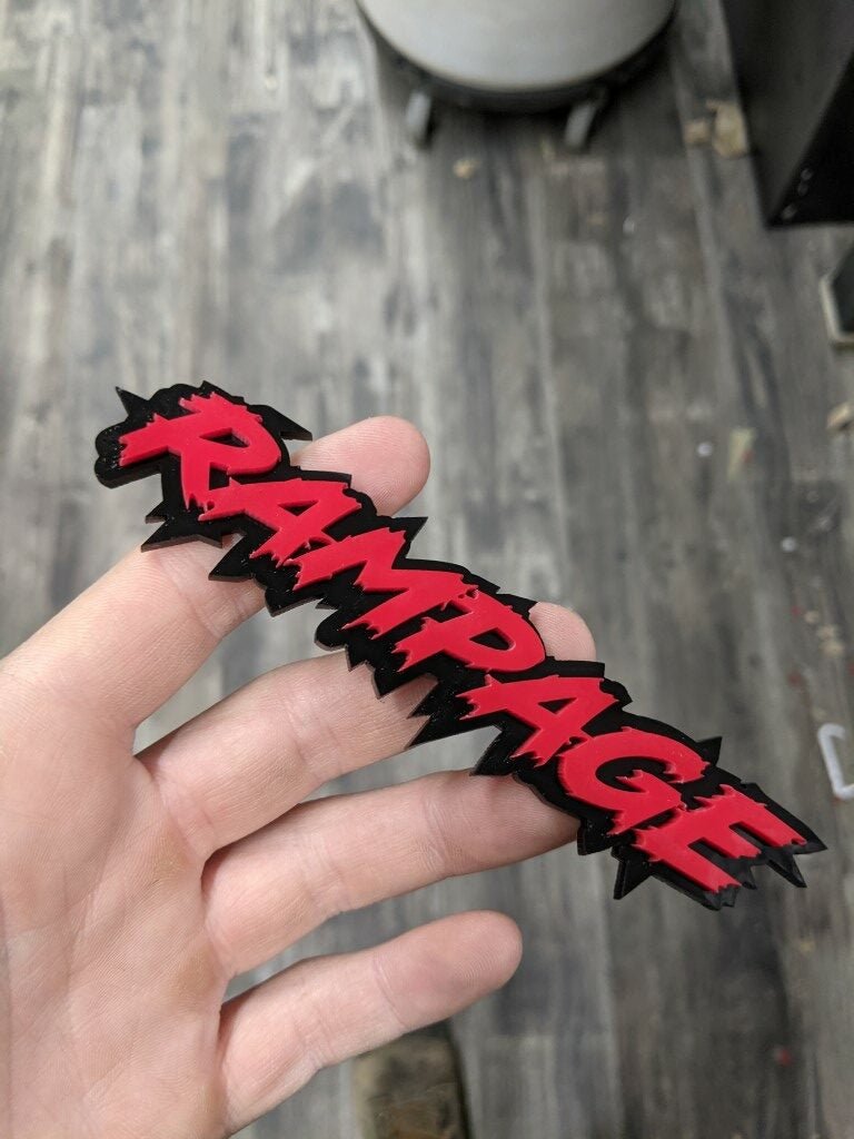 Rampage Car Badge - Red On Gloss Black - Lightning Font