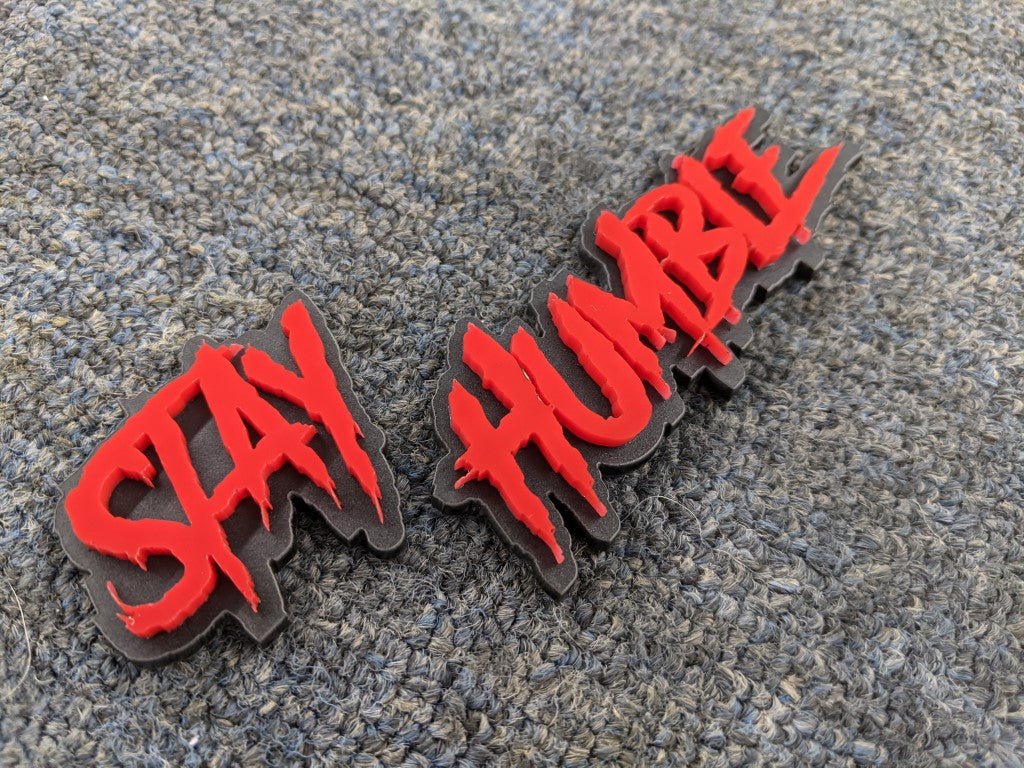 Stay Humble Car Badge - Red On Matte Black - Aggressive Font