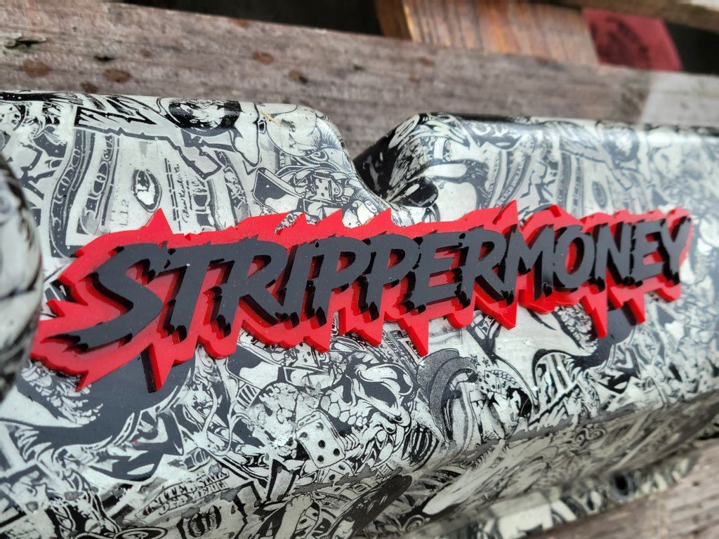 Stripper Money Car Badge - Matte Black On Red - Lightning Font