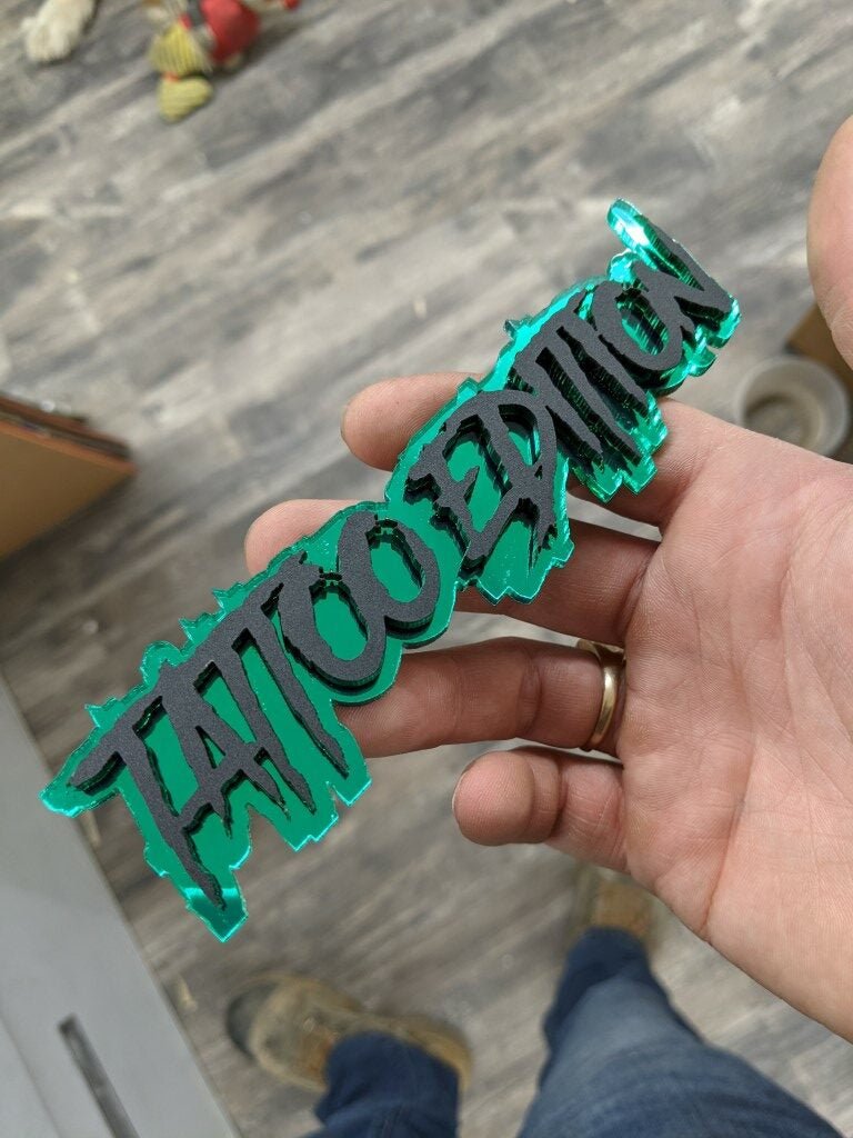 Tattoo Edition Car Badge - Matte Black On Mirror Green - Aggressive Font