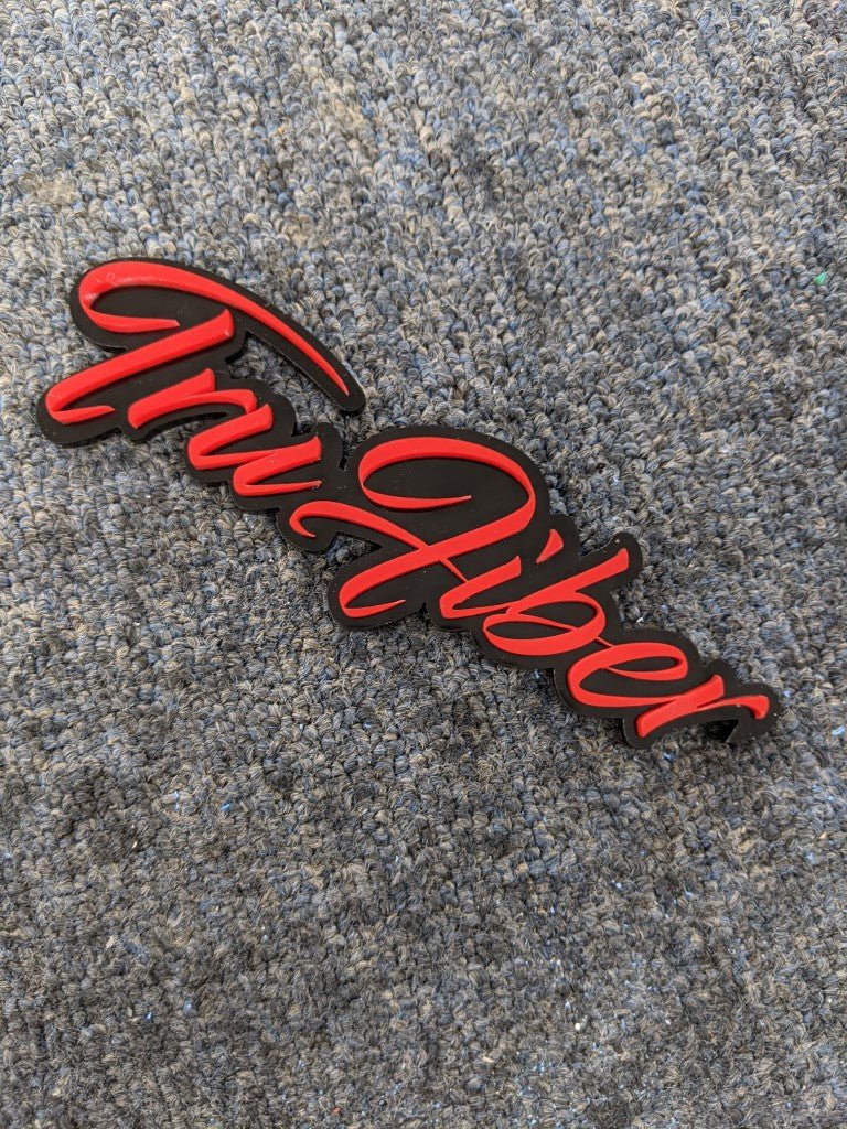 Tru Fiber Car Badge - Red on Gloss Black - Script Font