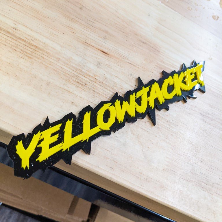 Yellowjacket Car Badge - Yellow on Gloss Black - Lightning Font - Tape Mounting